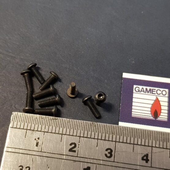 Pack of 10 black oxide steel screws, 1-72 thread, button head, Torx socket, 1/4″ long.