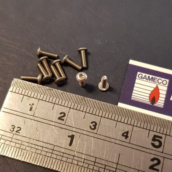 Pack of 10 stainless steel screws, 1-72 thread, button head, Torx socket, 1/4″ long.