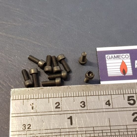 Pack of 10 black oxide steel screws, 2-56 thread, socket head, hex/allen socket, 1/4″ long.
