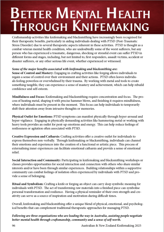 - Article on mental health benefits of knifemaking with highlights on 3 non-profits working with veterans and first responders