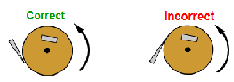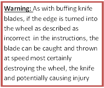 Never turn a knife into the wheel. Always have the edge of the knife angled down in the direction that the wheel is turning. Don’t draw the tip of the knife clear across the wheel. When pulling the knife across either wheel, take it away from the wheel when the tip is in the middle of the wheel, otherwise you may catch the tip on the edge.