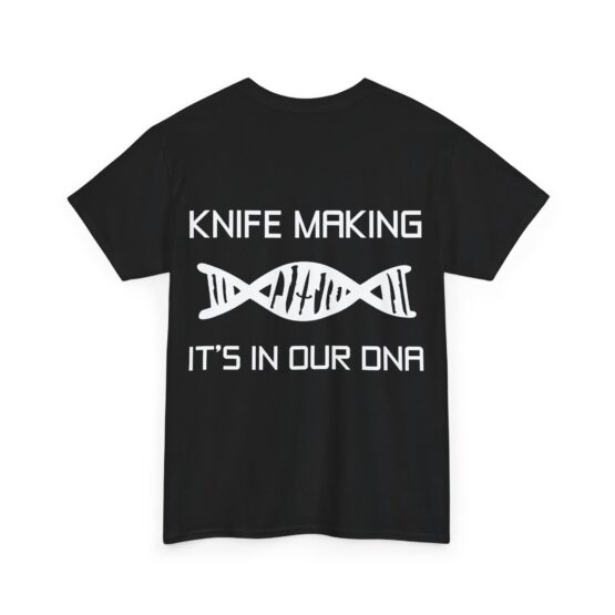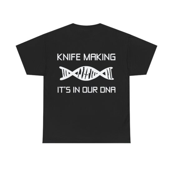 The DNA – unisex heavy cotton tee is the basic staple of any knifemaker’s wardrobe. The specialty spun fibers provide a smooth surface, and no side seams mean there are no itchy interruptions under the arms. The shoulders have tape for improved durability.