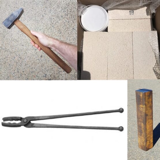 The Forging Starter Kit includes a brick forge kit, a horizontal-pein forging hammer, a pair of tongs and a piece of 1045 steel to use as a post anvil.
