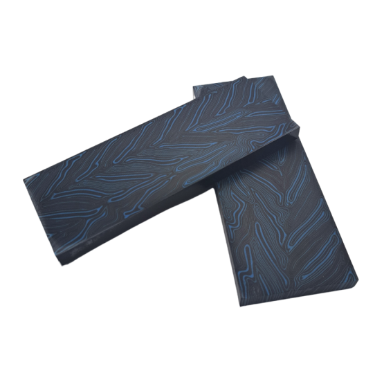 G10 Damascus Handle Scales with a random black and blue pattern throughout. G10 is a resilient material with properties similar to fiberglass.