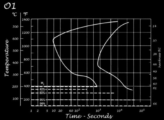 O1 tool steel is a general purpose oil hardening, cold work, high carbon tool steel with an excellent blend of hardness, toughness and ease of sharpening. It is simple to work whether making knives by stock removal or forging and is a popular choice for bushcraft knives. Historically, it was famously used by Bo Randall in the creation of combat knives for servicemen in World War 2.