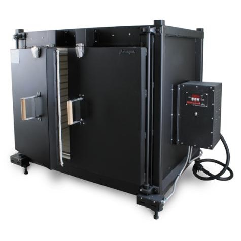 Expand the production capacity of your glass studio with the massive 28.28-cubic-foot PAF30-1 glass annealing kiln. Make glass vases, bowls, and figurines without worrying about having enough annealing capacity. The PAF30-1 is designed for annealing, so the maximum temperature is 1100°F (593°C). With this kiln, you are buying only the heating capacity that you need for annealing. The PAF30-1 is stackable. As your business grows, add another PAF30-1 without using more floor space. The feet of the top kiln fit into the four stacking points of the bottom kiln. Level the kiln in minutes with levelers that are built into the feet. Spring-loaded quick-release door latches allow one-handed loading into the hot kiln. The doors open smoothly on heavy-duty 3/4” hinge shafts. The firing chamber opening is lined on all four sides with a fiber rope door seal. The doors also each have a seal where the doors meet in the center. Each door has a safety switch that turns off the elements when the door is opened. The controller remains powered and automatically resumes firing when you close the doors. You will enjoy the convenience of digital firing. The solid state Sentry Xpress controller continually monitors the firing so you can spend your time productively without closely watching the kiln. The sealed touch pad keeps out dust and is easy to wipe clean. The kiln heats from the sides and back. Dropped, recessed brick grooves protect the elements for long life. The kiln is heavily insulated for economical operation. The insulating firebricks and fiberboard, wrapped in heavy-gauge steel, soak up heat for slow, efficient cooling: