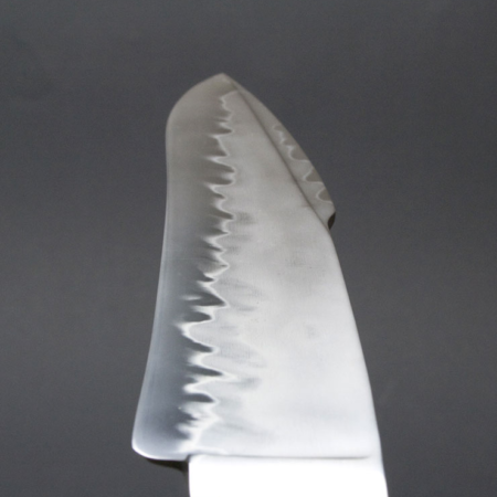 Plate quenching will give a more optimal hardening response than air quenching and will keep blades straighter than oil quenching. Blades are typically cool enough to handle within a minute and can then be given a cold treatment or tempered.