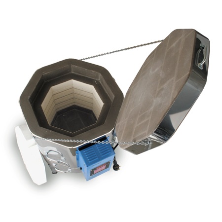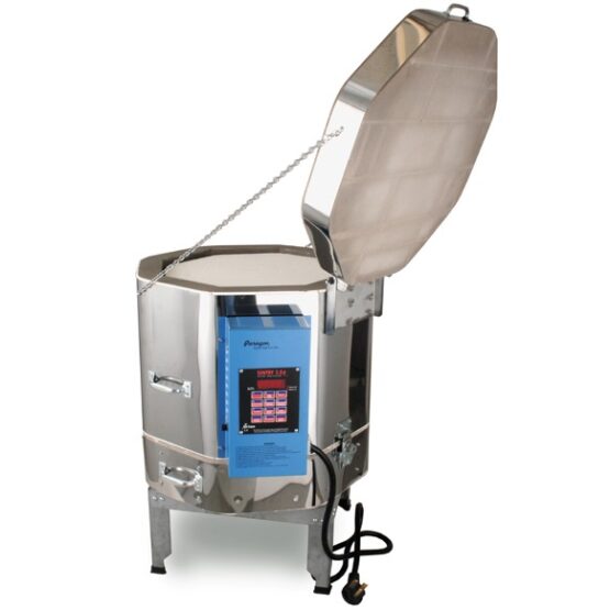 Program the digital controller for the exact consistency of glass melt that you desire. The hinged lid floats to compensate for expansion and has a lock-in lid support, which you can remove if you prefer to use the lid chain. You can also fire pottery or glass fusing in the Vulcan. Comes with a one year warranty and heavy-duty stand. (Please note: Due to the long firing cycles of a crucible kiln, the warranty does not cover the heating elements.) We recommend the optional mercury relay upgrade for long firings. (The relay sends power to the heating elements from the controller.) The mercury relays found on our large industrial kilns outlast mechanical relays. The life of the quiet, reliable mercury relay has been measured in millions of on/off cycles. Wires are fastened to the elements with heat-dissipating connectors refined and proven over many years in Paragon kilns. The Vulcan control box is finished in a durable high temperature, water-base blue paint, which releases low emissions during spraying. This creates a safer working environment for our employees and cuts down on pollution. A kiln stand is included. The stand is complete with mar-proof plastic feet. And, of course, the glass blower’s Vulcan furnace is made in America by skilled workers. Many of them have been with Paragon for over a decade. Furniture (sold separately): Order the C10-R (10” round x 1/2”) shelf and 1 ½” wide posts of the correct length to support your crucibles. Scroll down to Accessories below.